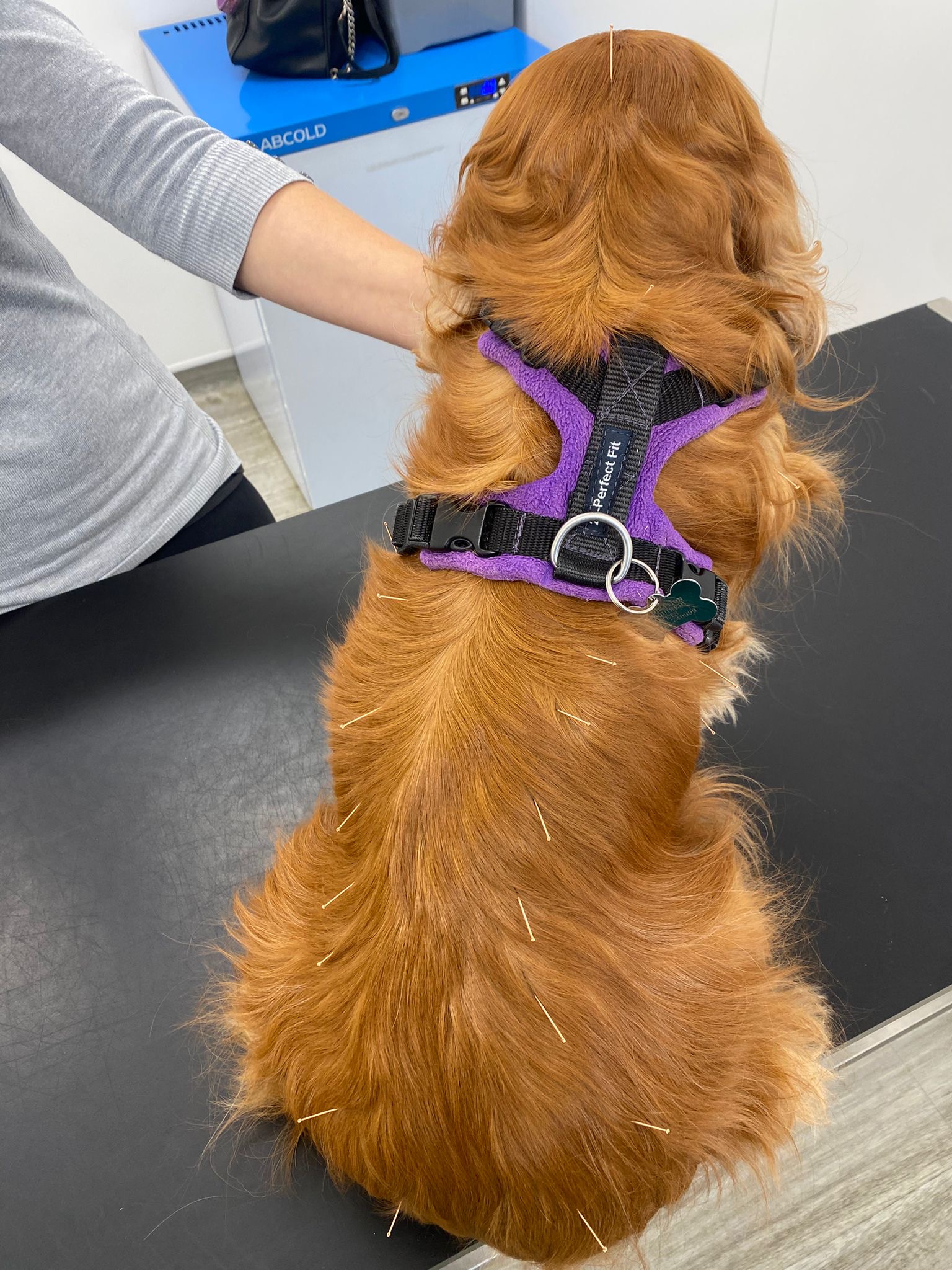 At the start of each session, Abi examines Breagh, feeling each limb and all down the muscles either side of her spine. She started with an initial course of one session per week, mainly placing needles either side of her spine and focussing on the key area next to the spine that has been an issue long term, and was consistently uncomfortable during palpation. At each session these areas were checked and she was examined for any new areas of concern.