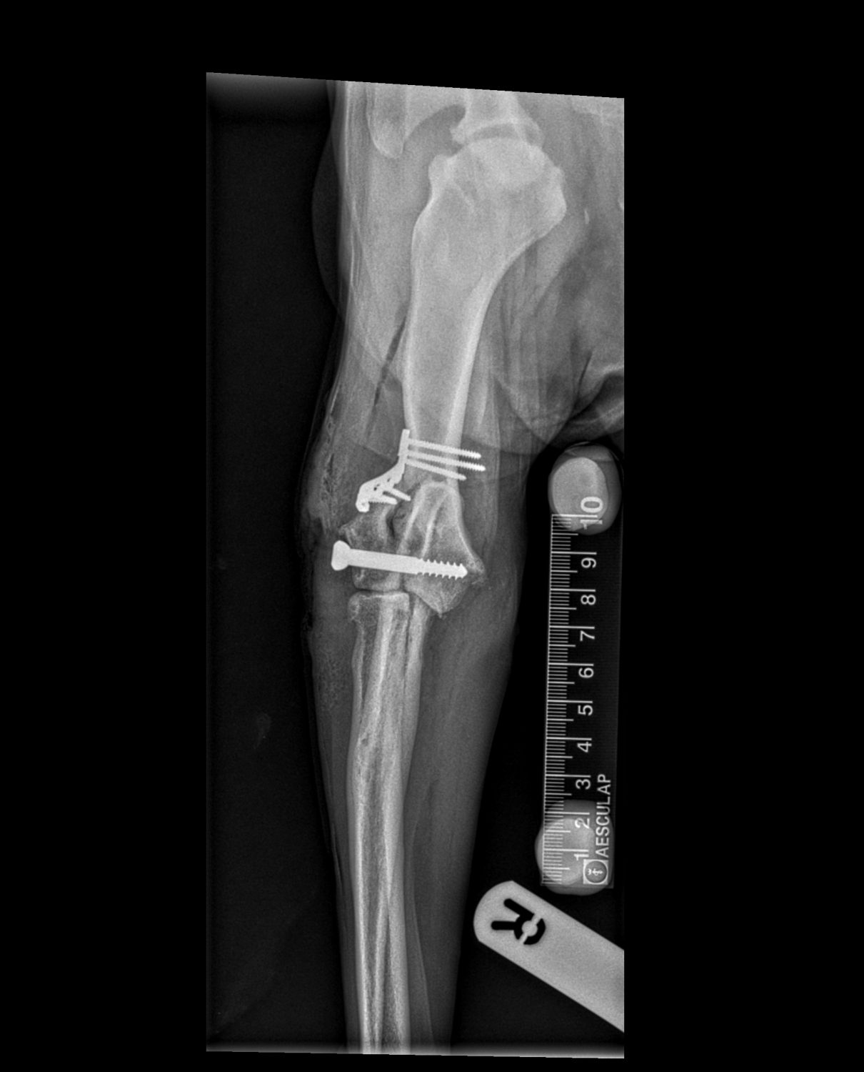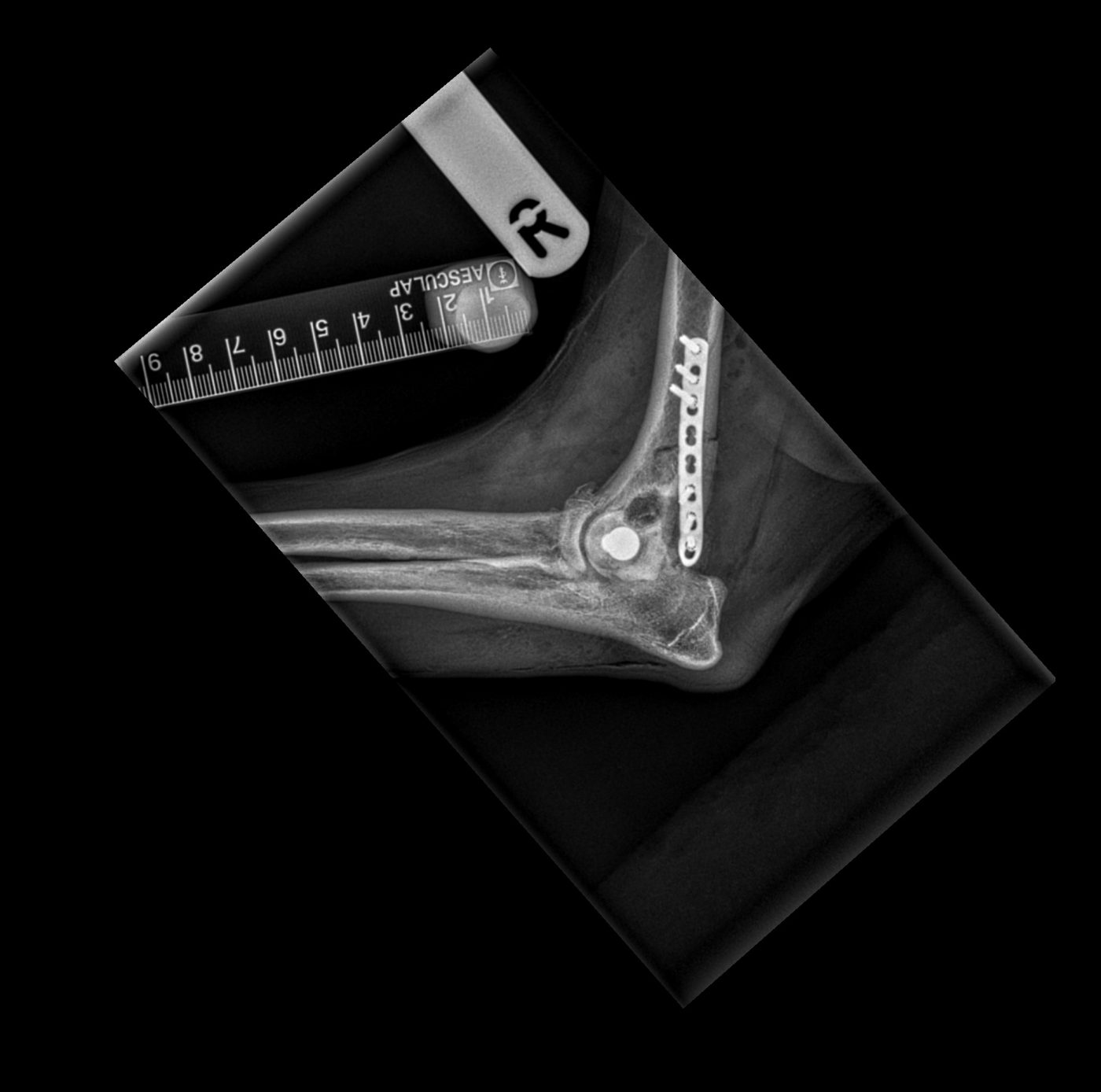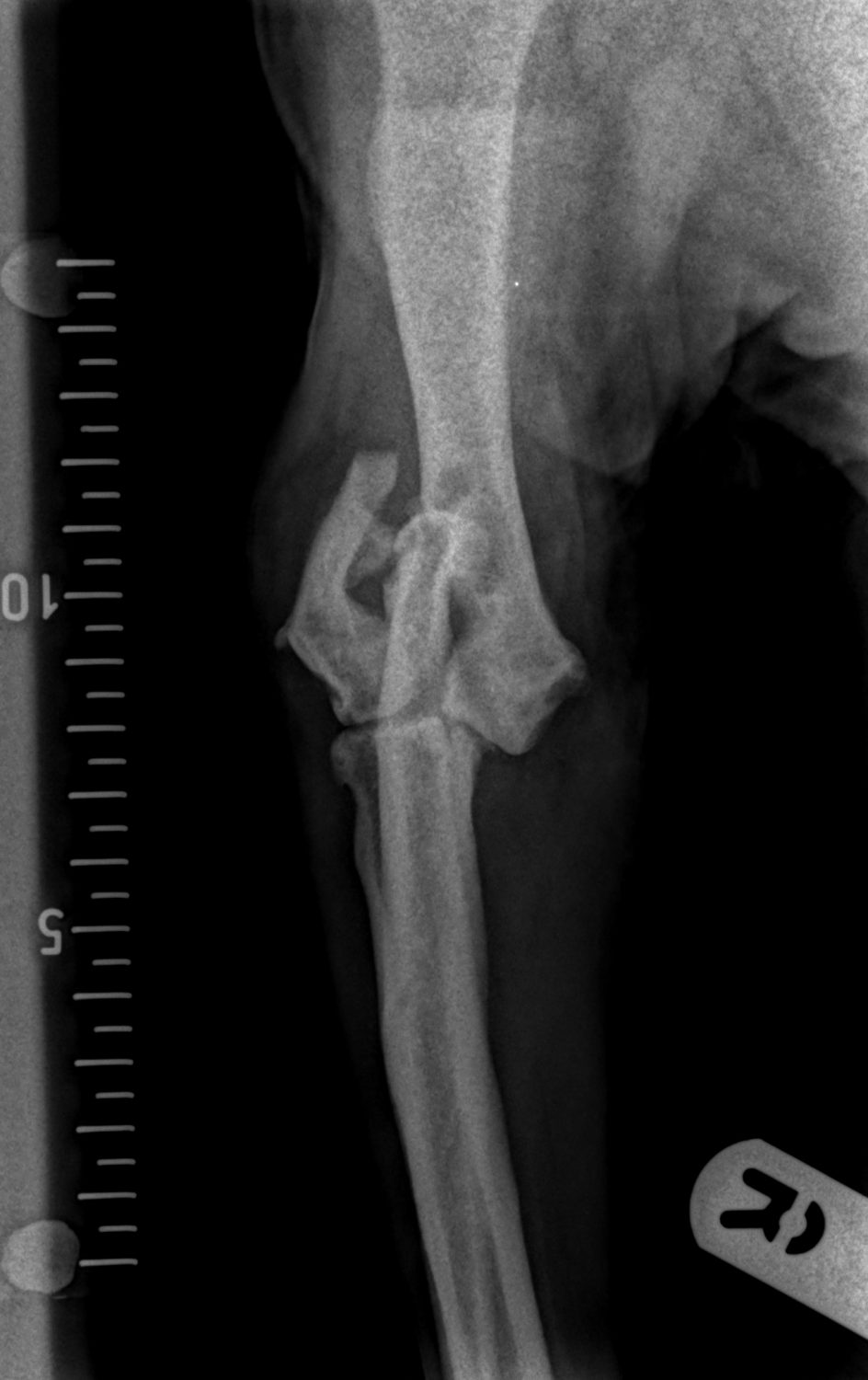 Chase is a twelve-year-old English Springer Spaniel, with a history of severe arthritis in his elbows, presented lame in the right elbow after sustaining an injury whilst jumping into the car. X-rays revealed a humeral intracondylar fissure that had fractured.